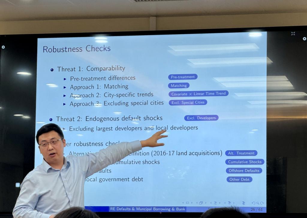 9月25日上午,中央财经大学2025年专题学术讲座在沙河校区学院楼3号楼127会议室举行。本次讲座邀请到北京大学光华管理学院副教授张宇,分享题为“Not in the Spread: Developer Defaults, Municipal Borrowing, and Bank Absorption in China”的前沿研究。讲座由金融学院金融科技系主任王忏教授主持,学院师生积极参加。