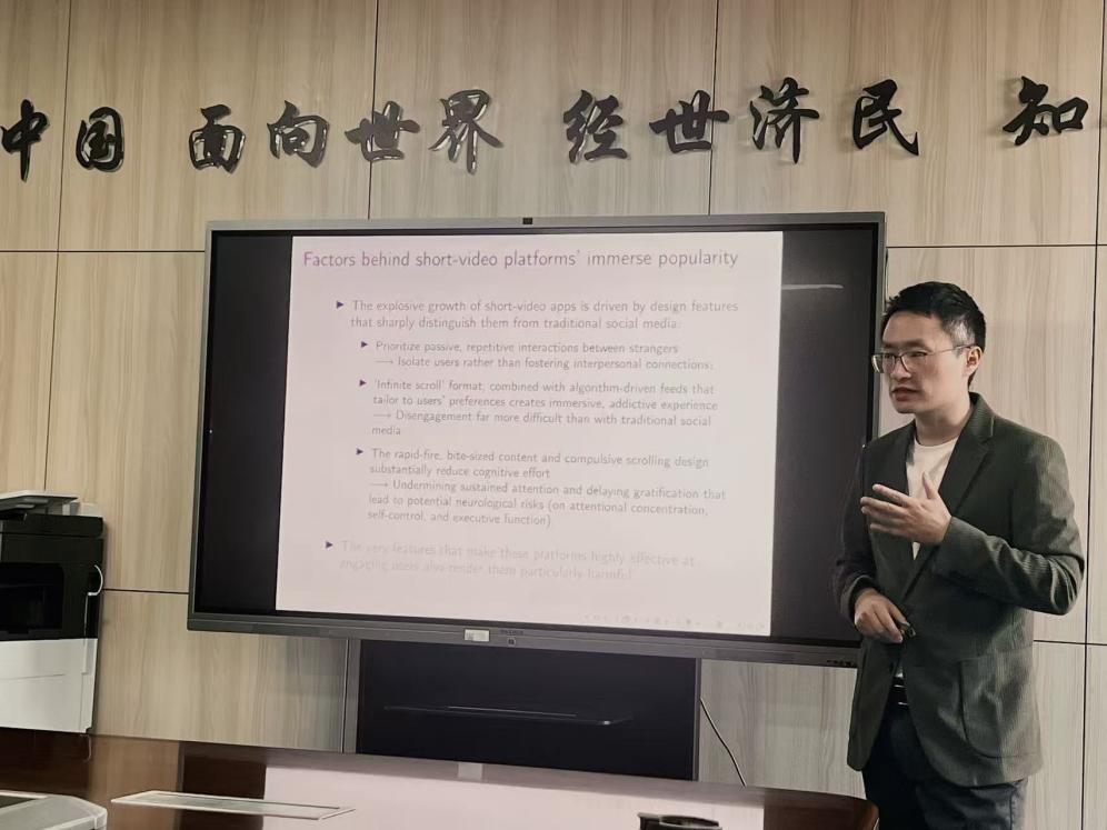 讲座围绕刘畅副教授的合作论文“Flick, Click and Sick: Mental Health Risk and Short Video Platforms”展开。从短视频平台的全球发展脉络切入,不到十年间,短视频平台实现全球性成功,TikTok、Facebook等平台的用户使用时长显著超越传统社交媒体,而同期全球心理健康水平呈下降趋势。短视频平台无需添加好友即可建立连接、算法驱动的无限滚动内容流,精准匹配用户偏好等鲜明设计特点,既可能降低用户认知能力,又易形成成瘾性使用体验。