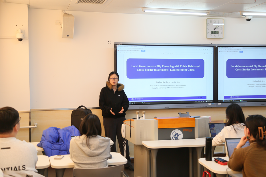 11月17日下午,中央财经大学2025年专题学术讲座在沙河校区10号楼429成功举办,主题为“Local Governmental Big-Financing with Public Debts and Cross-Border Investments: Evidence from China”。本次讲座由对外经济贸易大学中国金融学院刘津宇老师主讲,中国财政发展协同创新中心阮睿老师主持,中心师生参加。