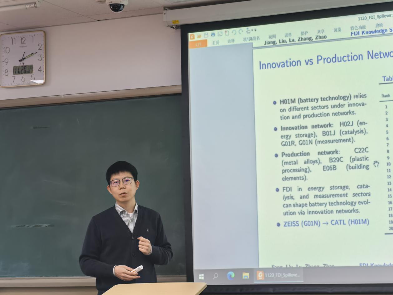 刘灿雷老师首先介绍了研究的背景与核心观点。他指出,现有关于FDI知识溢出的研究多从生产网络出发,采用识别一般性溢出效应的思路进行分析。然而,同一产品在技术创新阶段所依赖的部门,与其在实际生产过程中所依赖的部门并不一致。例如,对于电池而言,技术创新需要借助能源储存、化学催化、电磁反应等领域的知识,而实际生产更依赖金属材料、零部件组装等投入。因此,从创新网络视角切入,能够更准确地解释FDI带来的知识溢出。研究结果显示,相较于传统基于生产网络的方法,创新网络框架在解释FDI知识溢出方面具有更强的解释力。