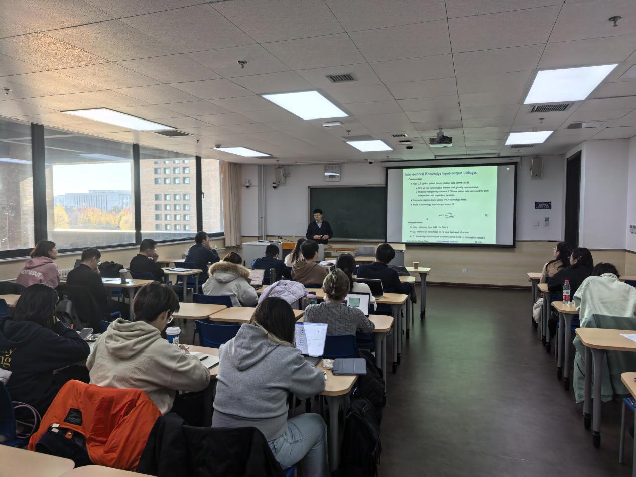 11月20日,中央财经大学2025年专题学术讲座在沙河校区学院楼13号楼321教室举行。对外经济贸易大学经济学院副研究员刘灿雷,分享题为“Identifying FDI Knowledge Spillovers Using Innovation Networks”的精彩研究。讲座由国际经济与贸易学院钟腾龙副教授主持,学院多位师生参加。