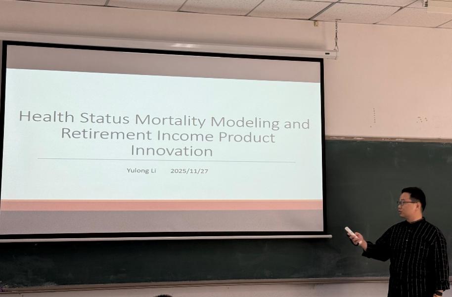 11月27日上午,中央财经大学2025年专题学术讲座暨中国精算研究院精算论坛在沙河校区主教308教室举行。本次论坛邀请到中国精算师协会李玉龙博士,为与会师生带来了题为“Health Status Mortality Modeling and Retirement Income Product Innovation”的学术报告。论坛由保险学院、中国精算研究院廖朴副教授主持,学院师生积极参与。