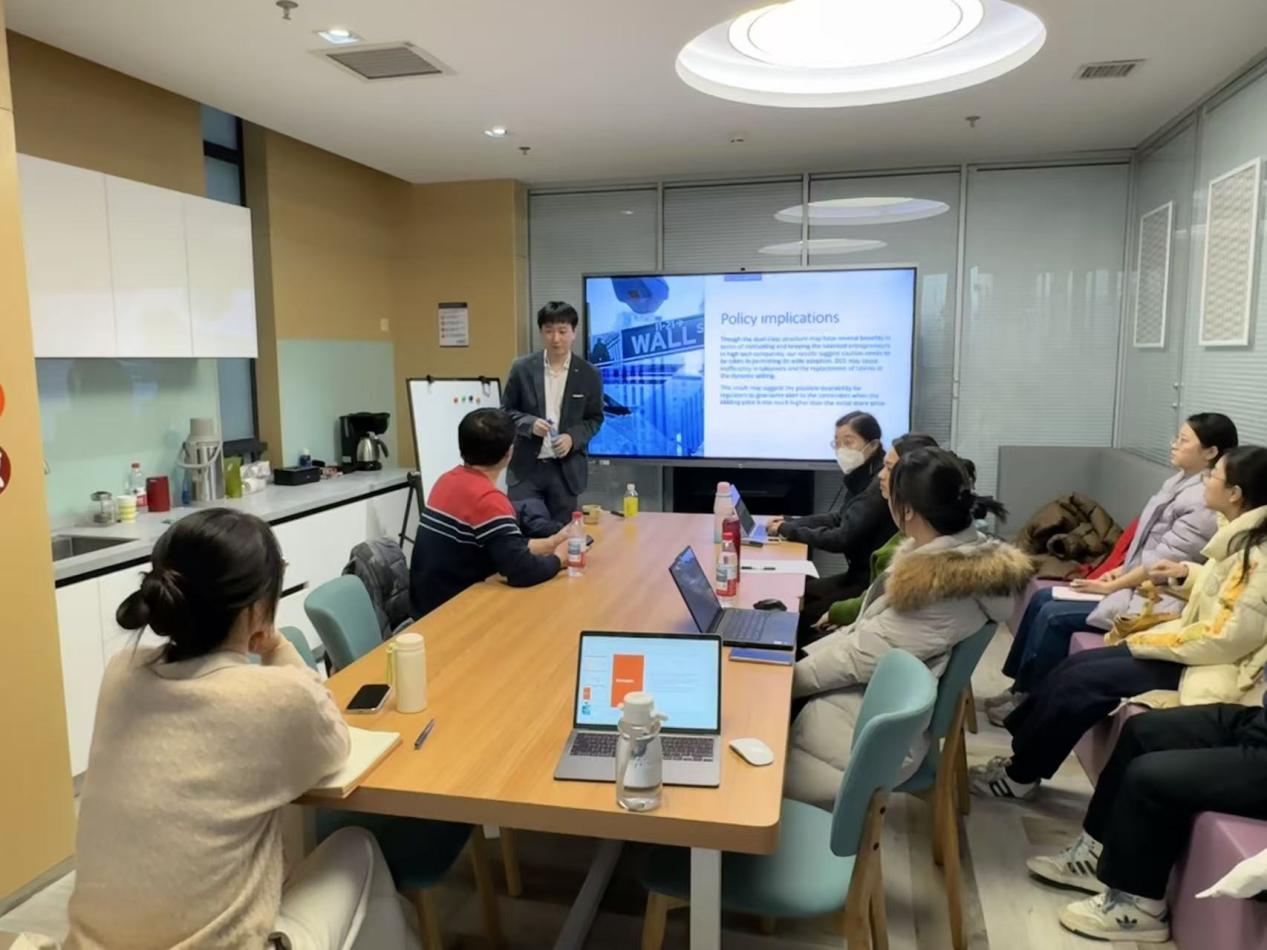 12月3日,中央财经大学2025年专题学术讲座在沙河校区10号楼4层财税资评工作坊举行。此次讲座邀请到新加坡南洋理工大学经济系副教授包特老师,分享题为“One-Share-One-Vote and Dual-Class Shares in the Laboratory”的精彩研究。本次讲座由财政税务学院高宏宇助理教授主持,多位师生参与。