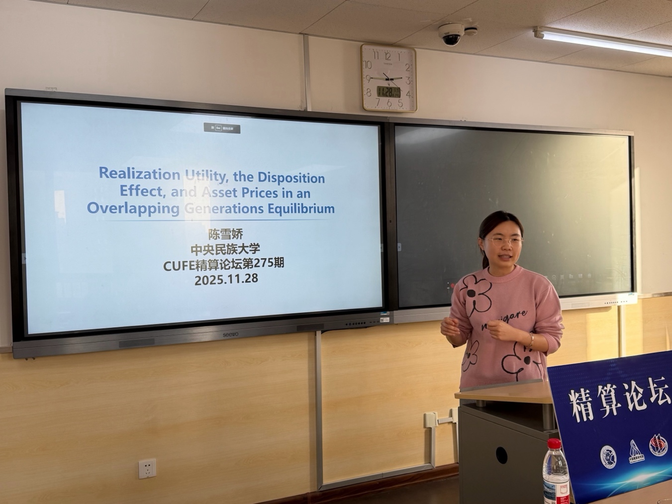 11月28日下午,中央财经大学2025年专题学术讲座暨中国精算研究院第275期精算论坛在中央财经大学沙河校区13号楼301教室举行。本次论坛邀请到中央民族大学经济学院陈雪娇老师,为与会师生带来了题为“Realization Utility, the Disposition Effect, and Asset Prices in an Overlapping Generations Equilibrium”的学术报告。论坛由保险学院、中国精算研究院廖朴副教授主持,硕博研究生积极参与并认真聆听了报告。