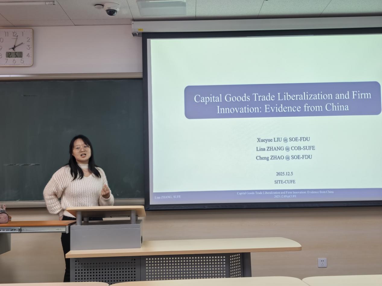 12月5日,中央财经大学2025年专题学术讲座在沙河校区学院楼13号楼321教室举行。此次讲座邀请到上海财经大学商学院助理研究员张丽娜老师,分享题为“Capital Goods Trade Liberalization and Firm Innovation: Evidence from China”的精彩研究。本次讲座由国际经济与贸易学院钟腾龙副教授主持,多位老师和同学参加。