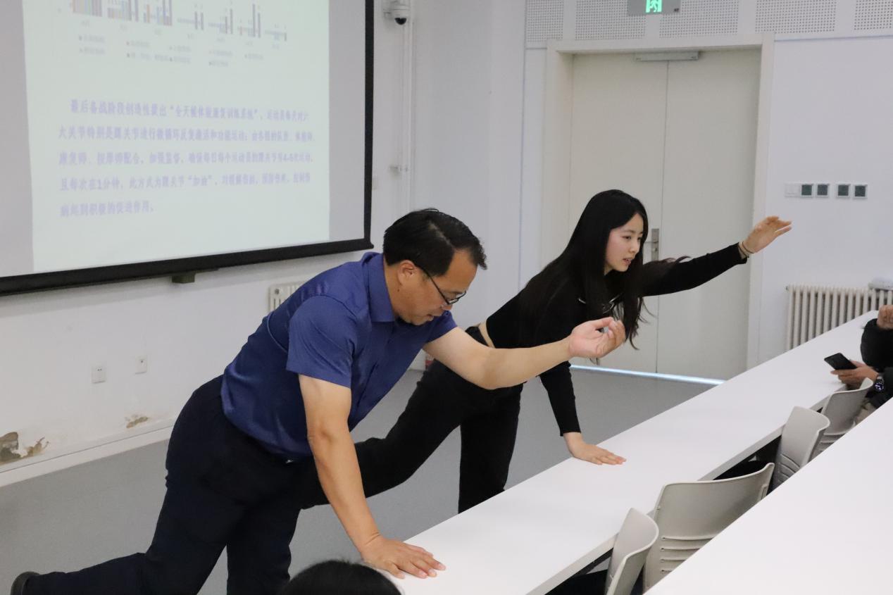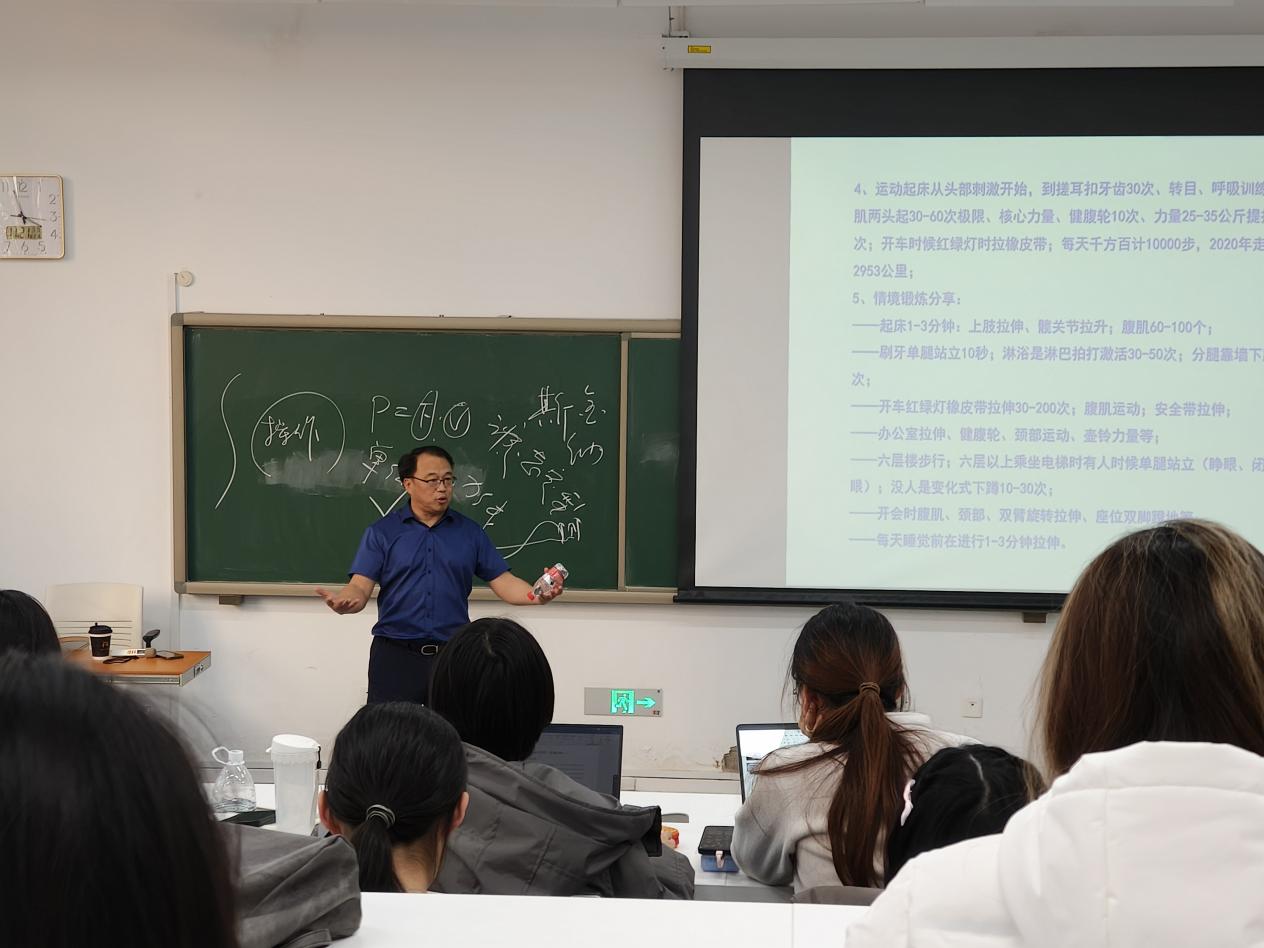 袁守龙研究员分享了“数智化与运动健康实践”的具体应用。他介绍了基于数智化思维的结构化运动健康模式,并提出了“四位一体”理念,即学习中运动、运动中思考、思考中工作、工作中运动。他还列举了在起床、通勤、办公、会议等多种日常场景下,如何利用碎片化时间开展有氧运动、力量训练、拉伸和平衡协调等针对性锻炼,为师生提供了实用性强、易于操作的锻炼指导方案。讲座还特别设置了互动环节,他现场示范了多个便于日常练习的锻炼动作,并邀请听众跟随练习。在随后的问答环节,现场气氛十分热烈。他强调:“数智化的精髓在于‘个性化’与‘适应性’,每个人都是自身健康的第一责任人,应学会做自己的‘智能教练’。”这种理论与实操相结合、答疑与启发并重的形式,赢得现场阵阵掌声,交流氛围浓厚。