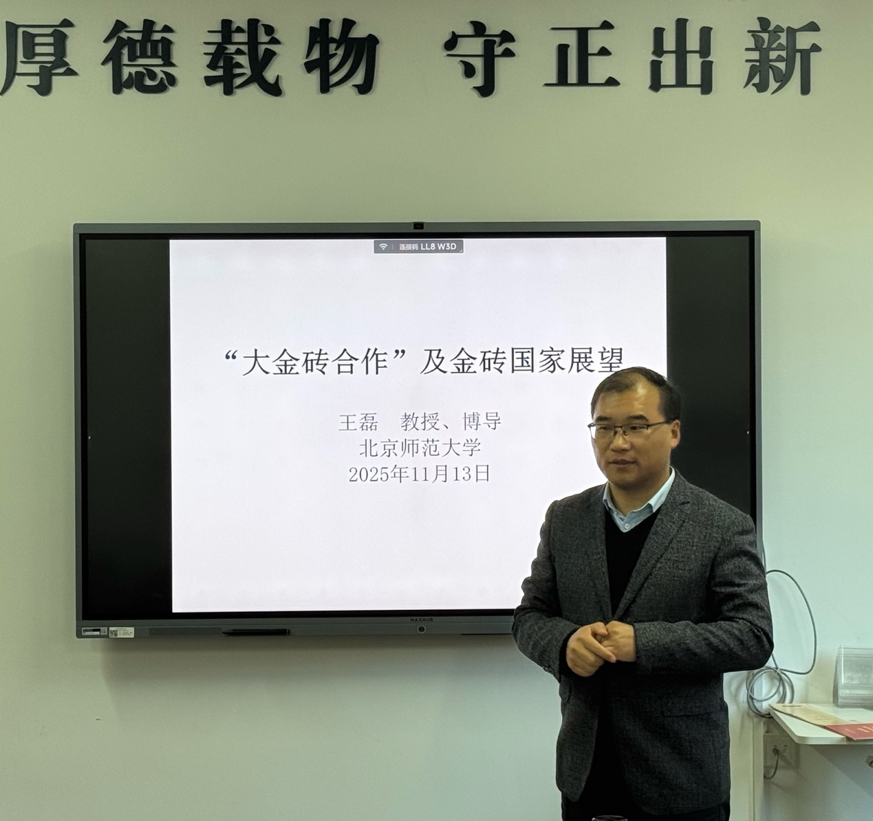 11月13日下午,中央财经大学2025年专题学术讲座暨新时代新征程“国家理财”新阐释系列学术创新讲座在图配楼314会议室顺利举办。本次讲座邀请北京师范大学政府管理学院教授、北京师范大学金砖国家合作研究中心主任王磊教授,分享主题为“大金砖合作及金砖国家展望”的报告。讲座围绕“大金砖合作”的战略意义、扩员逻辑与制度演进进行了系统深入的阐释,为学校师生带来了一场兼具理论高度与现实意义的高质量学术盛会。国家财经战略研究院副院长赵国钦主持,学院多位师生参加。